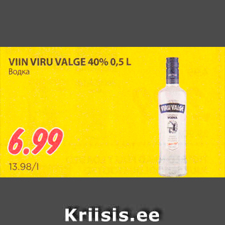 Период кампании: 03.05.2017 - 16.05.2017 Цена: 6.99€ ВодкаVIIN VIRU VALGE 40% 0,5 L Kriisis.ee не несёт ответственности за содержание комментариев. Мнение автора комментария может отличаться от мнения kriisis.ee. По возможности, отслеживая комментарии, kriisis.ee оставляет за собой право удалять их без объяснения причин. Если вы заметили неуместный комментарий, пожалуйста сообщите нам о нём.