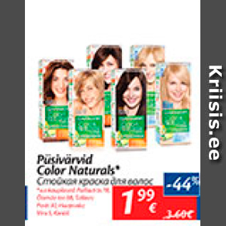 Период кампании: 23.05.2017 - 29.05.2017 Цена: 1.99€ Стойкая краска для волос*кроме kauplused Pallasti tn 18, Õismäe tee 88, Tallinn; Posti 30, Haapsalu; Viru 5, Kiviõli Pesuvärvid Color Naturals* *v.a. kauplused Pallasti tn 18, Õismäe tee 88, Tallinn; Posti 30, Haapsalu; Viru 5, Kiviõli