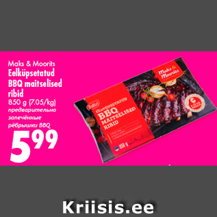 Период кампании: 05.07.2017 - 30.08.2017 Цена: 5.99€ Предварительно запечённые рёбрышки BBQ850 g (7.05/kg) Maks & Moorits