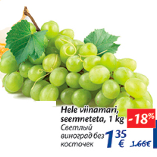 Период кампании: 19.09.2017 - 25.09.2017 Цена: 1.35€ Светлый виноград без косточекHele viinamari, seemnetega, 1 kg