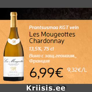 Период кампании: 21.11.2017 - 27.11.2017 Цена: 6.99€ Вино с защ.геонаим., Франция13,5%, 75 cl Prantsusmaa KGT vein Les Mougeottes