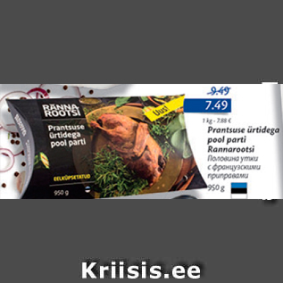 Период кампании: 23.11.2017 - 06.12.2017 Цена: 7.49€ Половина утки с французскими приправамиPrantsuse ürtidega pool parti Rannarootsi, 950 g