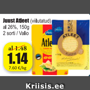 Период кампании: 01.12.2017 - 14.12.2017 Цена: 1.14€ Сыр(viilutatud) al 26%, 150 g / 2 sorti / Valio Juust Atleet