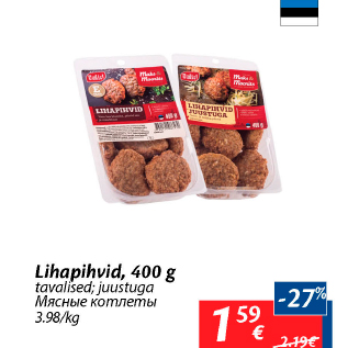 Период кампании: 19.12.2017 - 25.12.2017 Цена: 1.59€ Мясные котлетыtavalised; juustuga Lihapihvid, 400 g