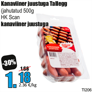 Период кампании: 29.01.2018 - 04.02.2018 Цена: 1.18€ Сосиски куриные с сыром(jahutatud 500g HK Scan Kanaviiner juustuga Tallegg