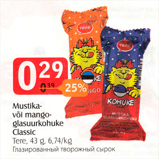 Период кампании: 06.02.2018 - 19.02.2018 Цена: 0.29€ Глазированный творожный сырокTere, 43 g Mustika või mangoglasuurkohuke Classic