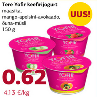 Период кампании: 15.02.2018 - 25.02.2018 Цена: 0.62€ Кефирный йогуртmaasika, mango-apelsini-avokaado, õuna-müsli, 150 g Tere Yofir keefirijogurt