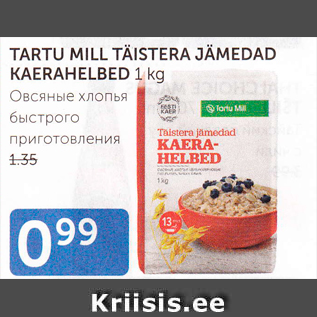 Период кампании: 05.06.2018 - 11.06.2018 Цена: 0.99€ ОВСЯНЫЕ ХЛОПЬЯ БЫСТРОГО ПРИГОТОВЛЕНИЯTARTU MILL TÄISTERA JÄMEDAD KAERAHELBED 1 KG