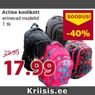 Период кампании: 16.08.2018 - 26.08.2018 Цена: 17.99€ Ранецerinevad mudelid 1 tk Active koolikott