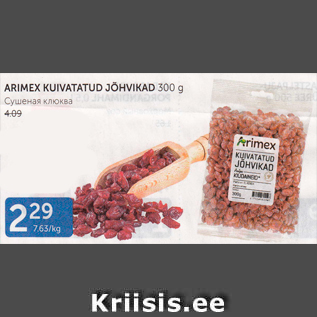 Период кампании: 13.11.2018 - 19.11.2018 Цена: 2.29€ Сушеная клюкваARIMEX KUIVATATUD JÕHVIKA 300 G