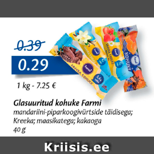 Период кампании: 06.12.2018 - 19.12.2018 Цена: 0.29€ Сырокmandariini-piparkoogivürtside täidisega; Kreeka; maasikatega; kakaogaБ 40 g Glasuuritud kohuke Farmi