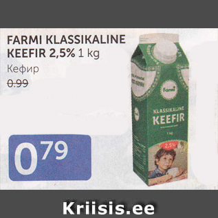 Период кампании: 19.02.2019 - 25.02.2019 Цена: 0.79€ КЕФИР2,5%, 1 KG FARMI KLASSIKALINE KEEFIR