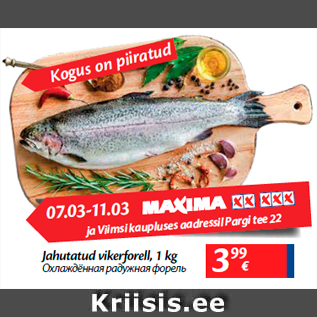 Период кампании: 05.03.2019 - 11.03.2019 Цена: 3.99€ Охлаждённая радужная форель07.03-11.03 MAXIMA XX, XXX ja Viimsi kaupluses aadressil Pargi tee 22