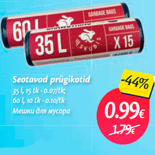 Период кампании: 05.03.2019 - 18.03.2019 Цена: 0.99€ Мешки для мусорa35 l, 15 tk - 0.07/tk; 60 l, 10 tk - 0.10/tk Seotavad prügikotid