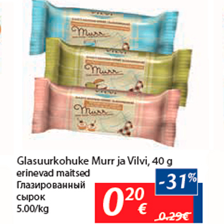 Период кампании: 09.04.2019 - 15.04.2019 Цена: 0.20€ Глазированный сырокerinevad maitsed Glasuurkohuke Murr ja Vilvi, 40 g