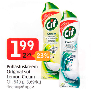 Период кампании: 16.04.2019 - 29.04.2019 Цена: 1.99€ Яистящий кремCif, 540 g Puhastuskreem Original või Lemon Cream