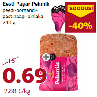 Период кампании: 18.04.2019 - 28.04.2019 Цена: 0.69€ Хлебpeedi-porgandipastinaagi-pihlaka, 240 g Eesti Pagar Pehmik