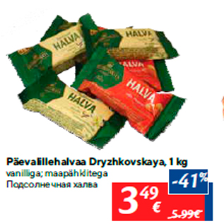 Период кампании: 30.04.2019 - 06.05.2019 Цена: 3.49€ Подсолнечная халваvanilliga; maapähklitega Päevalillehalvaa Dryzhkovskaya, 1 kg