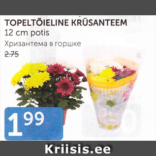 Период кампании: 01.07.2019 - 31.07.2019 Цена: 1.99€ ХРИЗАНТЕМА В ГОРШКЕ12 cm potis TOPELTÕIELINE KRÜSANTEEM