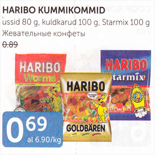 Период кампании: 02.07.2019 - 08.07.2019 Цена: 0.69€ ЖЕВАТЕЛЬНЫЕ КОНФЕТЫussid 80 g, kuldkarud 100 g, Starmix 100 g HARIBO KUMMIKOMMID