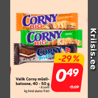 Период кампании: 17.09.2019 - 23.09.2019 Цена: 0.49€ Мюсли батончики• 8 sorti Valik Corny müslibatoone,