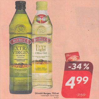 Продукт оливковое масло borges, 750 мл продавался со скидкой в магазине Hüper Rimi, Rimi, Mini Rimi в период с 15.10.2019 по 21.10.2019 по цене 4.99 евро.