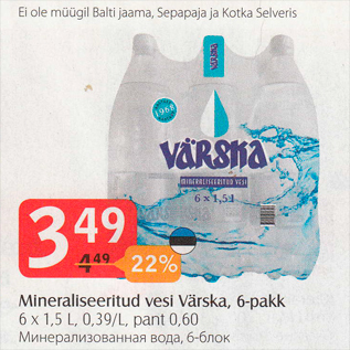 Ei ole müügil Balti jaama, Sepapaja ja Kotka Selveris Mineraaliseeritud vesi Värska, 6-pakk