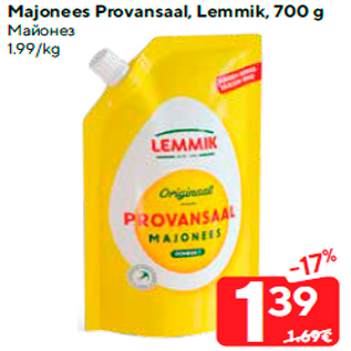 Период кампании: 19.11.2019 - 25.11.2019 Цена: 1.39€ МайонезMajonees Provansaal, Lemmik, 700 g