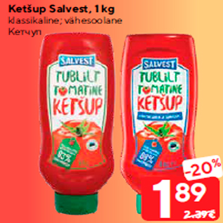 Период кампании: 26.11.2019 - 02.12.2019 Цена: 1.89€ Кетчупklassikaline; vähesoolane Ketšup Salvest, 1 kg