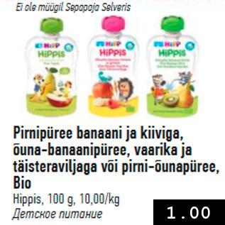 Период кампании: 03.01.2020 - 20.01.2020 Цена: 1.00€ Детское питаниеHippis, 100 g Pirnipüree banaani ja kiiviga, õuna-banaanipüree, vaarika ja täisteraviljaga või pirni-õunapüree, Bio