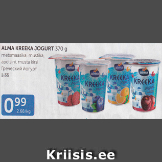 Период кампании: 14.01.2020 - 20.01.2020 Цена: 0.99€ ГРЕЧЕСКИЙ ЙОГУРТmetsmaasika, mustika, apelsini, musta kirsi ALMA KREEKA JOGURT 370 G