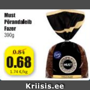Период кампании: 17.01.2020 - 30.01.2020 Цена: 0.68€ Черный хлеб Fazer 390 гMust Põrandaleib Fazer 390 g