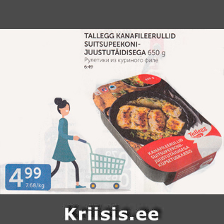 Период кампании: 28.01.2020 - 03.02.2020 Цена: 4.99€ РУЛЕТИКИ ИЗ КУРИНОГО ФИЛЕTALLEGG KANAFILEERULLID SUITSUPEEKONIJUUSTUTÄIDISEGA 650 G