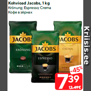 Период кампании: 28.01.2020 - 03.02.2020 Цена: 7.39€ Кофе в зёрнахKrönung; Espresso; Crema Kohvioad Jacobs, 1 kg