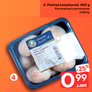 Период кампании: 04.02.2020 - 10.02.2020 Цена: 0.99€ Фасованные шампиньоныPakitud šampinjonid, 400 g