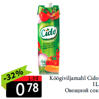 Период кампании: 10.02.2020 - 16.02.2020 Цена: 0.78€ Овощной сокKöögiviljamahl Cido