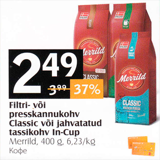 Период кампании: 25.02.2020 - 05.03.2020 Цена: 2.49€ КофеMerrild, 400 g Filtri- või presskannukohv Classic või jahvatatud tassikohv In-Cup