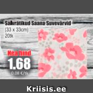 Период кампании: 06.03.2020 - 12.03.2020 Цена: 1.68€ Салфетки(33 x 33 cm) 20 tk Salvrätikud Saana Suvevärvid
