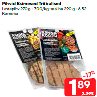 Период кампании: 10.03.2020 - 16.03.2020 Цена: 1.89€ КотлетыLastepihv 270 g - 7.00/kg; sealiha 290 g - 6.52 Pihvid Esimesed Triibulised