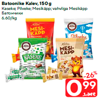 Период кампании: 21.04.2020 - 27.04.2020 Цена: 0.99€ БатончикиKaseke; Pilveke; Mesikäpp; vahvliga Mesikäpp Batoonike Kalev, 150 g