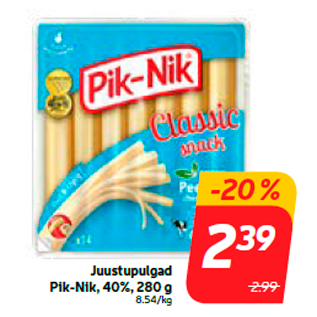 Период кампании: 21.04.2020 - 27.04.2020 Цена: 2.39€ Сырные палочки Pik-Nik, 40%, 280 гJuustupulgad