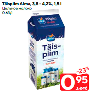 Период кампании: 28.04.2020 - 04.05.2020 Цена: 0.95€ Цельное молокоTäispiim Alma, 3,8 - 4,2%, 1,5 l