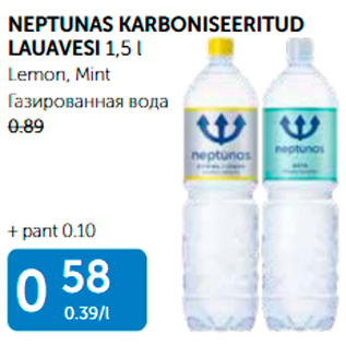 Период кампании: 26.05.2020 - 01.06.2020 Цена: 0.58€ ГАЗИРОВАННАЯ ВОДАLemon, Mint NEPTUNAS KARBONISEERITUD LAUAVESI 1,5 L