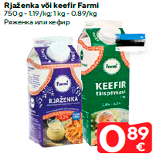 Период кампании: 02.06.2020 - 08.06.2020 Цена: 0.89€ Ряженка или кефир750 g - 1.19/kg; 1 kg - 0.89/kg Rjaženka või keefir Farmi