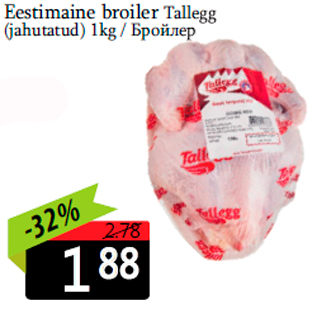Период кампании: 10.07.2020 - 12.07.2020 Цена: 1.88€ Бройлер(jahutatud) 1kg Eestimaine broiler Tallegg