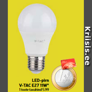 Период кампании: 07.07.2020 - 13.07.2020 Цена: 1.00€ Светодиодная лампа V-TAC E27 11W **v.a Postimaja, Sõle, Telliskivi ja Tartu Tasku Rimi superites ja Rimi minides. LED-pirn V-TAC E27 11W*