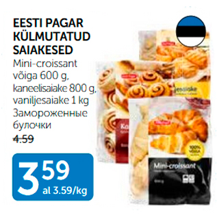 Период кампании: 07.07.2020 - 13.07.2020 Цена: 3.59€ ЗАМОРОЖЕННЫЕ БУЛОЧКИMini-croissant võiga 600 g, kaneelisaiake 800 g, vaniljesaiake 1 kg EESTI PAGAR KÜLMUTATUD SAIAKESED