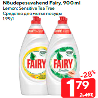 Период кампании: 21.07.2020 - 27.07.2020 Цена: 1.79€ Средство для мытья посудыLemon; Sensitive Tea Tree Nõudepesuvahend Fairy, 900 ml