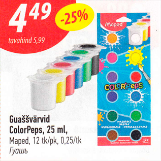 Период кампании: 04.08.2020 - 10.09.2020 Цена: 4.49€ ГуашьMaped, 12 tk/pk Guaššvärvid ColorPeps, 25 ml