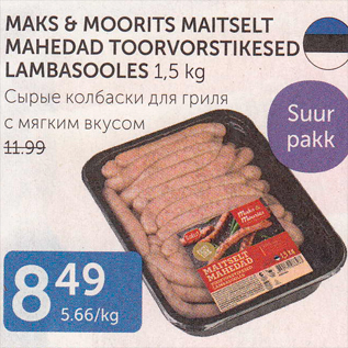 Период кампании: 11.08.2020 - 17.08.2020 Цена: 8.49€ Сырые колбаски для гриля с мягким вкусомMAKS & MOORITS MAITSELT MAHEDAD TOORVORSTIKESED LAMBASOOLES 1,5 kg